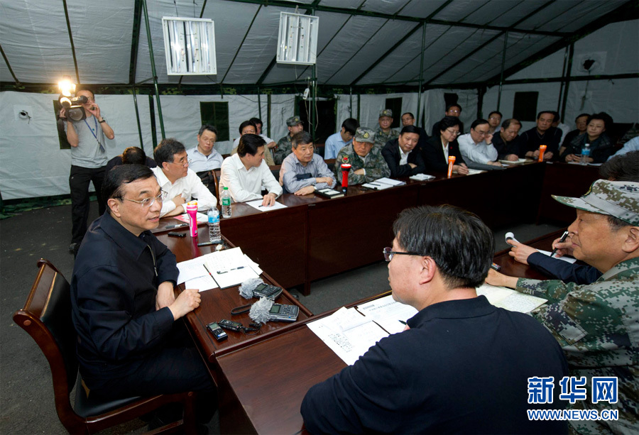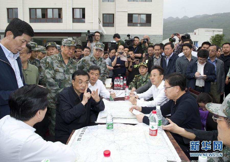 4月20日,中共中央政治局常委、国务院总理李克强抵达四川芦山地震灾区察看灾情,部署抗震救灾工作。这是李克强在受灾严重的龙门乡召开现场会。新华社记者 黄敬文 摄