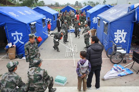 救援部队在搭建帐房 雅安摄协刘南康摄