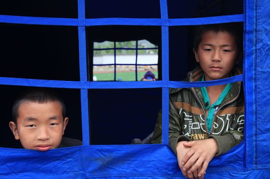 救灾帐房里的孩子 雅安摄协刘南康摄