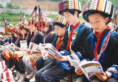 4月23日,广西贺州市开展“纪念‘世界读书日’国学经典进瑶山”活动。图为贺州市黄洞瑶族乡民族学校的瑶族学生在诵读国学经典《弟子规》。廖祖平摄(新华社发)