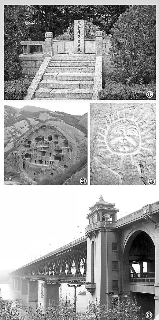 图①:江苏省苏州市昆山市的顾炎武墓(清)。 图②:北京市延庆县的延庆古崖居(明以前)。 图③:内蒙古自治区鄂尔多斯市的桌子山岩画群(新石器时代)。 图④:湖北省武汉市武汉长江大桥(1957年)。 制图:蔡华伟 |