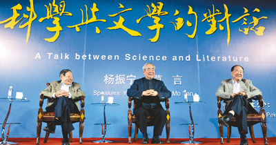 穿越55年的时光,一位华裔科学家和一位中国文学家相继登上诺贝尔奖的领奖台;15日,这两位诺奖得主——杨振宁与莫言,又同时登上了北京大学的讲坛,展开了一次“科学与文学的对话”。