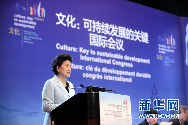 刘延东在致辞中指出,当今世界正处在大发展大变革大调整时期,文化在国家发展和人类进步中的作用日益凸显,迫切需要从文化的高度审视传统发展理论和发展道路;文化与经济、政治、社会关系更加紧密,迫切需要文化成为经济社会发展和人的全面发展的支撑力量;国与国之间相互依存不断加深,人文交流日趋深入,迫切需要文化发挥增信释疑、沟通心灵、深化友谊的独特优势。当前,走可持续发展道路已成为各国的共同选择,只有把可持续发展的理念凝聚成文化的共识,转化为人们的自觉行动,世界才能拥有更加美好的未来。她倡议,要尊重文化多样性和各国自主选择发展道路的权利,在包容中求共识、在差异中促和谐、在合作中共发展。要推动文化传承创新,以文化之力塑造人与人、人与社会、人与自然的和谐关系,为可持续发展提供强劲动力。要坚持文化创造源自人民、文化价值在于惠民的理念,优化文化发展环境,激发推动文化繁荣的生机与活力,不断满足人们精神文化需求。要深化跨文化交流,发挥文化影响力,共同推动和谐世界建设。中国政府将继续把可持续发展作为国家的基本战略之一,坚持以人为本、科学发展,在努力建设美丽中国、实现“中国梦”的同时,为人类繁荣进步作出应有贡献。