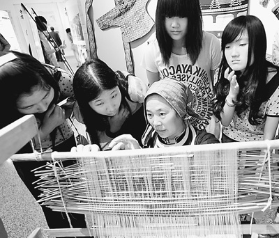 在湖南展厅,侗锦传承人向观众介绍织造技艺