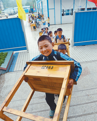 五月二十四日,四川省芦山地震一个多月后,雅安市雨城区上里镇中心学校的学生将课桌搬进加固后的综合楼。