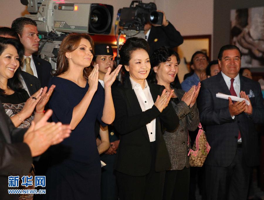 6月5日,中国国家主席习近平夫人彭丽媛在墨西哥总统夫人里韦拉陪同下,来到墨西哥特莱维萨电视台电视剧制作中心参观。 新华社记者 丁林 摄
