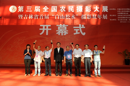 第三届全国农民摄影大展6月8日在吉林长春开幕。图为中国文联党组成员、书记处书记李前光,中国文联副主席段成桂,以及中国摄协主席、分党组书记王瑶等与会领导为获奖作者代表颁奖。 浦时 摄