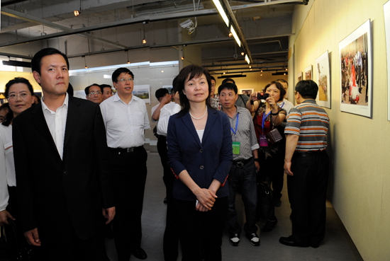 第三届全国农民摄影大展6月8日在吉林长春开幕。图为中国文联党组成员、书记处书记李前光(左一)等与会领导参观展览。 浦时 摄