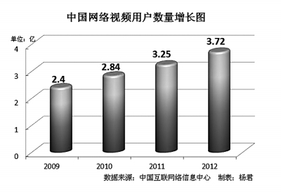 “2011—2012年,商业视听新媒体发展成为一支媒体新军,形成与广电媒体的竞争,市场份额在新媒体领域占据主要地位。”2013年视听新媒体蓝皮书分析,在近几年视频行业的高速发展中,视听节目网站的媒体价值被逐步认可,广告数量稳步增加。全国在线视频行业收入2010年还只有31.4亿元,2011年即实现翻番达到62.7亿元,2012年再增30亿元达到92.5亿元。