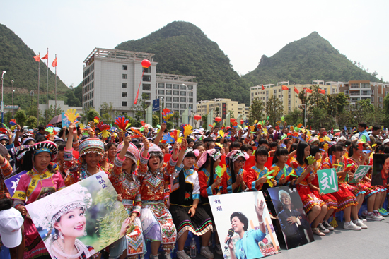 演出当天,天气异常炎热,但人们热情更高。“在听相声呢”,小伙子电话“汇报”着演出情况;老大爷带着望远镜,早早和老伴儿赶来占了个好位置。港安水泥公司的何陈与百余位工友看得合不拢嘴,忙着拍照,“现场看到这么多知名艺术家,我们老百姓高兴!”穿着少数民族盛装的关岭民族高级中学高一学生马凤兰是个漂亮的布依族女孩,她看到了她的老乡、著名歌手阿幼朵,激动极了。回到家乡的阿幼朵一曲高歌,在开场演出中把气氛调动得异常火热,她自己也很兴奋:“感谢中国文联关心我的家乡,惦记着我的兄弟姐妹。”