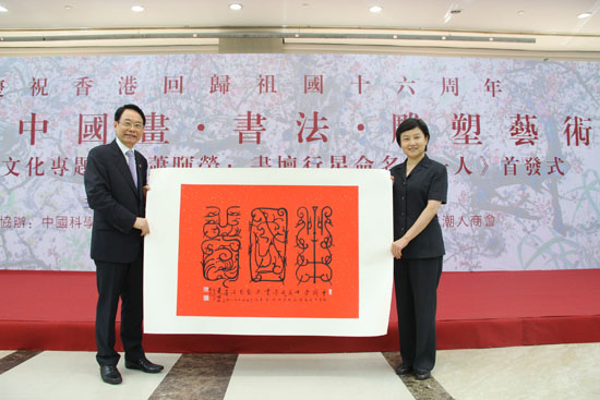 由中国文联、全国政协书画室、中国美协联合主办的“萧晖荣中国画·书法·雕塑艺术展”近日在北京举行。7月4日,萧晖荣向中国文联捐赠书法和雕塑作品。中国文联副主席杨承志出席活动并代表中国文联接受捐赠。