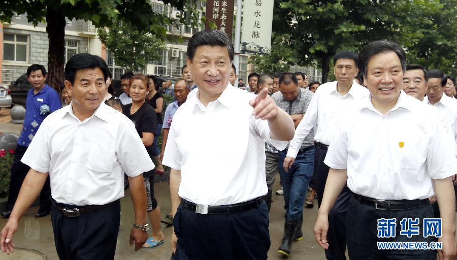 7月11日至12日,中共中央总书记、国家主席、中央军委主席习近平在河北省调研指导党的群众路线教育实践活动。这是习近平在正定县塔元庄村看望镇村干部和村民。新华社记者鞠鹏摄