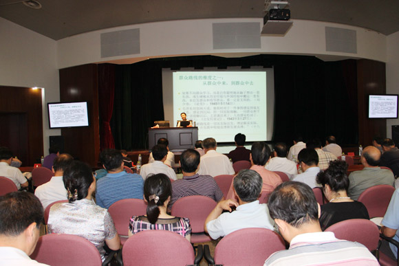 7月19日,中国文联在中国文艺家之家举办党的群众路线教育实践活动专题讲座。图为中央党校党建部教授、政党制度教研室主任祝灵君作题为《坚持群众路线--做好新形势下的群众工作》的讲座。中国文艺网 董大汗 摄