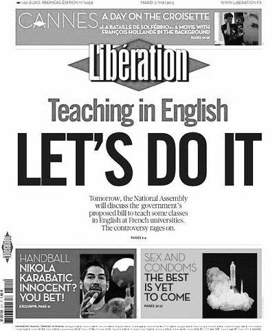 据法国全国性大报、左翼最大的报纸《解放报》统计,法国目前已有790种高校课程用英语上课。该报认为菲奥拉索部长的想法没错,5月21日的封面甚至只用英语,赫然打出大标题“Teaching in English LET’S DO IT”(“用英语教学,让我们这么干!”)。《解放报》代表着法国日渐壮大的一个群体,他们的特点是年轻、都市化、新潮。20年来,他们在生活中大量使用法式英语。在他们看来,负责提供语法建议和新外来语替代词的法兰西学术院早已过时。