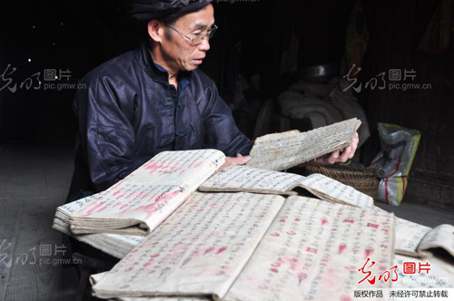 7月27日,贵州省榕江县水尾水族乡水盆村的水书先生王国朗读自己保存的水书。