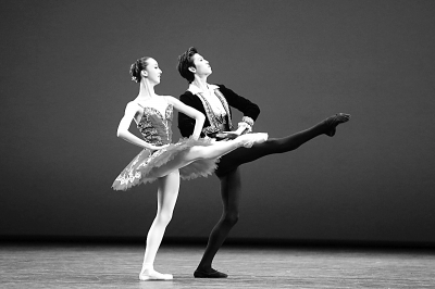 中国芭蕾舞演员邱芸庭(左)、武思聪(右)在表演《堂·吉诃德》。王小京摄
