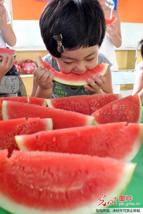 8月6日,河北省邯郸市曙光蓝天亚太幼儿园的小朋友在吃西瓜“啃秋”,迎接立秋的到来。“立秋”将至,我国民间有立秋之日“啃秋”的习俗,以此表达“啃下酷夏、迎接秋爽”的祈愿。郝群英摄 光明图片