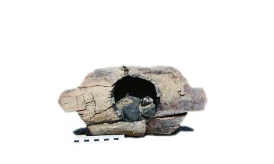 12号墓是座形制较为完整的墓葬,墓底有原木搭成的尸床,尸床上为一男尸,其肢体西侧有一用于火祭的容器。容器中间凿出圆坑,出土时中间还有15枚石子,圆坑的内壁被火灼得发黑。
