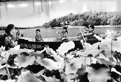 图一:园区巧妙营造出后有白塔做背景、前有荷花做映衬的“让我们荡起双桨”互动效果区,让游客亲身体验手握船桨的感受,仿佛置身于北海公园波光粼粼的湖面上。