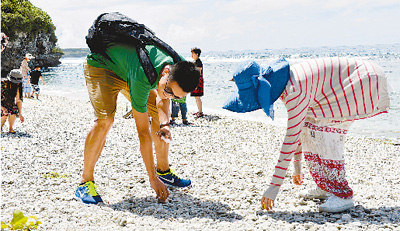 8月25日,在美国塞班旅游的中国年轻人正在捡游人丢的垃圾。 李维娜摄