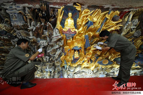 9月16日,重庆市大足区宝顶山千手观音造像修复工程现场,右侧实验区已实施了完整修复工艺,金光再现,引人注目。当日,重庆市大足区宝顶山千手观音造像的抢救性保护修复现场,位于实验区的34只手和12件法器已实施了完整修复工艺,包括石质本体修复、大漆贴金修复、法器彩绘修复,文物专家们将以此检验修复效果并跟踪监测修复区域稳定性和持久性。