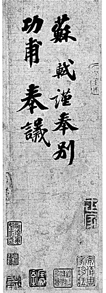《功甫帖》分两行书有9字“苏轼谨奉别功甫奉议”,为苏轼奉别友人郭功甫时所写的手札,字数虽少,却极富神采、极为珍贵,历代收藏家对此评价都很高。郭功甫长苏轼一岁,二人政见不同,却常互赠诗画,唱和频繁。据专家考证,《功甫帖》应该是苏轼三十六七岁时所作。熙宁初,王安石执政,几年后,郭功甫被擢升为殿中丞,后在奉议郎致仕,路过杭州,期间(熙宁四年至七年)苏东坡正在杭州任通判,据推测这幅手札就在这段时间完成。清代书画鉴藏家李佐贤在《书画鉴影》中记载,《功甫帖》与苏轼的另一幅著作《刘锡勒草》以及米芾的两幅著作合裱在一起,成了《苏米翰札》合册。而据书画鉴定家马成名考证,这一合册民国年间被天津的银行家许汉卿保藏,4幅著作均通过从头装裱,其间这幅《功甫帖》何时从许汉卿手中流出不得而知。