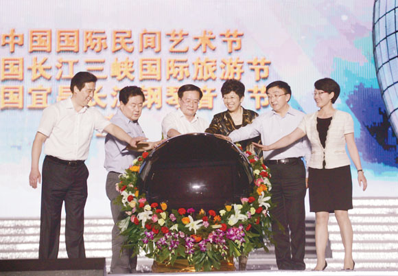 中国文联党组书记、副主席赵实,国家旅游局党组成员吴文学,中国文联副主席、中国音协分党组书记、驻会副主席徐沛东,重庆市副市长谭家玲,湖北省委副书记、省长王国生,湖北省委常委、宜昌市委书记黄楚平登台按动水晶球启动开幕式