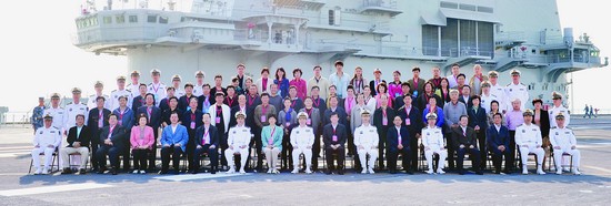 中国文联文艺志愿服务团全体成员与海军官兵在辽宁舰甲板上合影