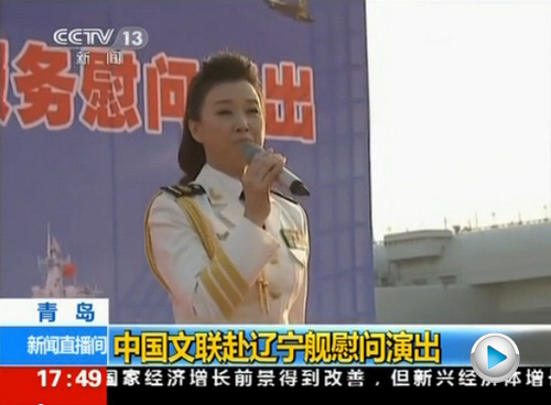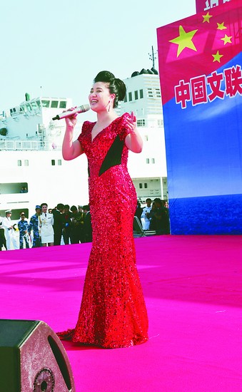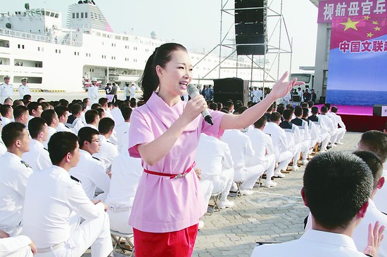 10月9日,中国文联文艺志愿服务团的艺术家们在青岛某军港码头辽宁舰旁为海军官兵奉上精彩的慰问演出。图为演出现场,背景是中国航母的英姿。记者 彭 宽 摄