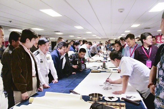 笔会自始至终,都有众多喜爱书画艺术的海军战士,或者兴致勃勃地站在书画家身后,仔细揣摩他们的用笔,或者凝神站到已经完成的作品前,默默体会其中的奥妙。