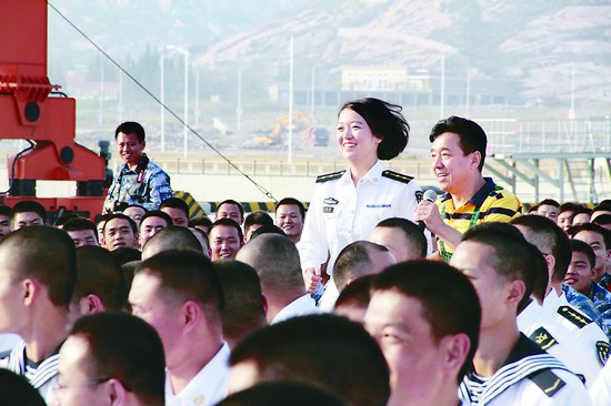 姜昆、戴志诚、朱军在表演和主持节目时,也纷纷把他们在辽宁舰上看到的官兵们的文化生活和励志心声,巧妙融入作品之中,传达出一份深深的感动和尊敬;