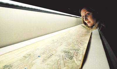 当地时间10月23日,英国伦敦维多利亚与阿伯特博物馆(V&A museum)举办“中国画名作 700—1900”展览。本次展出将持续到2014年1月19日,展出中国古代优秀绘画作品70余件,时间跨度1200多年,绝大部分作品从未在英国展出过。维多利亚与阿伯特博物馆获得了展出作品的独家复制权。复制品对原作的细节进行了完整再现。参观者可以在博物馆及其官网上购买。图为一位博物馆工作人员正在观看清代画家徐扬的画作《姑苏繁华图》。