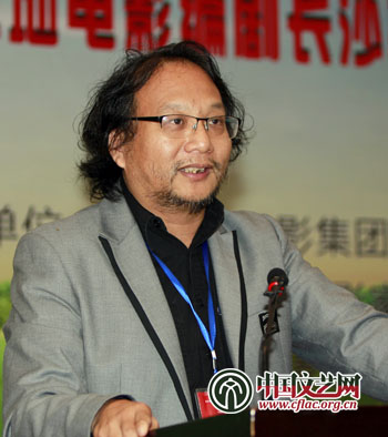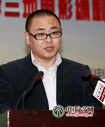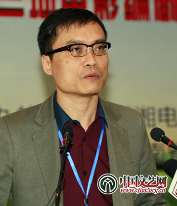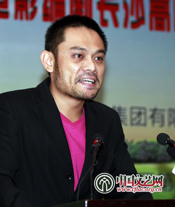 图为《刺陵》编剧林超荣发言,“美国人都开始讲中国故事了,比如《功夫熊猫》,我的孩子看得很开心,我却很惊慌。”中国文艺网 张志勇 摄