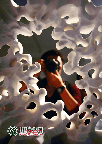 图为12月8日,一名摄影者在拍摄石雕艺术作品。新华社记者 刘广铭 摄