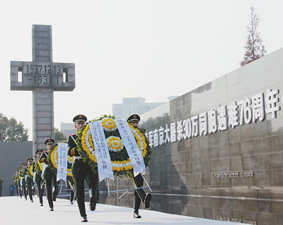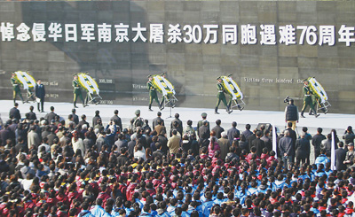 南京12月13日电 13日上午10时,凄厉的警报声响彻南京,江苏省暨南京市各界人士、驻宁部队代表和专程来宁的中外和平友好人士共约5000人,在侵华日军南京大屠杀遇难同胞纪念馆举行悼念仪式暨国际和平日集会,悼念76年前被侵华日军血腥屠杀的30多万遇难者。