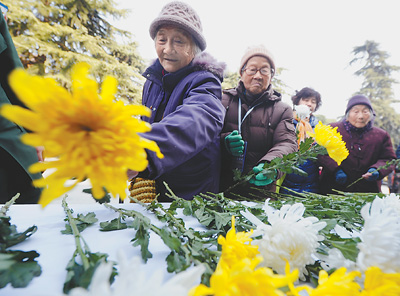 南京大屠杀幸存者和遇难者家属代表向30万遇难者献花。