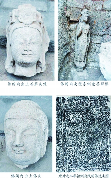 此外,在佛阁北壁护墙上新发现唐代绘制的佛龛壁画,有楣龛,内绘一高1.65米的坐佛,这是中原地区保存年代最早的寺院壁画。壁画揭去后,发现唐代护墙中镶嵌一块唐开元二年(714年)童子寺浮图铭方石,正面雕坐佛龛,两侧面为精美的线刻佛说法图。在佛阁遗址内还出土了一批精美的北齐佛像。