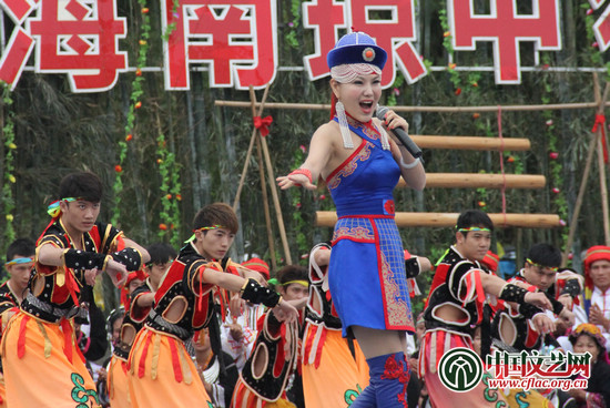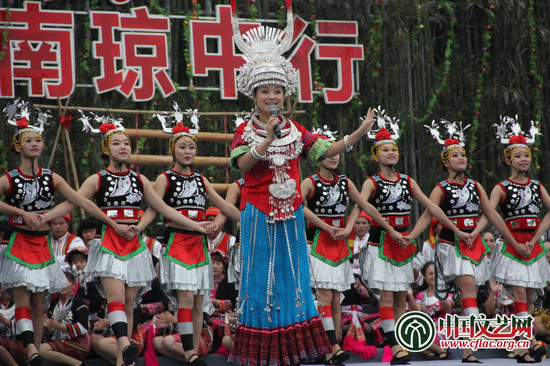 图为苗族歌手阿幼朵登台演出,她说虽然自己是贵州人,但琼中是她的第二故乡,看到这里的兄弟姐妹很高兴。中国文艺网 丁薇 摄
