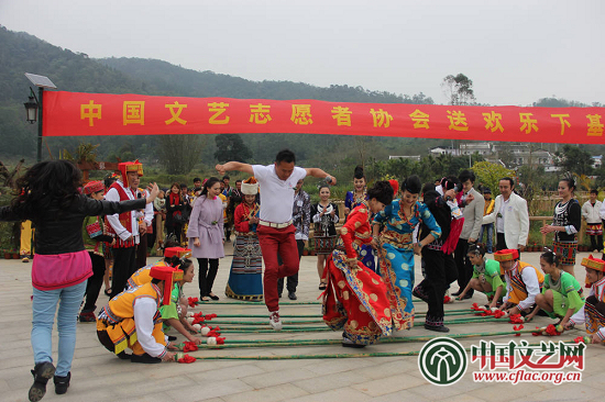 中国文艺志愿者协会的艺术家们在什寒村分会场与当地黎族苗族群众一起同跳竹竿舞。 中国文艺网 丁薇 摄