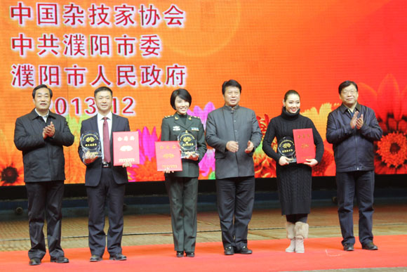 12月27日,第八届中国杂技金菊奖第三次剧目奖颁奖仪式在河南濮阳举行。图为与会领导给获奖单位颁发证书。中国文艺网 何瑞涓 摄