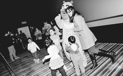 小观众和家长与动画片主人公玩偶合影。资料图片