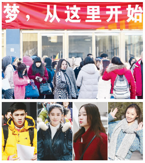 春节假期刚过, 2014年高校艺考就热热闹闹地开始了。中央戏剧学院、中国传媒大学、北京电影学院三大艺术院校的报考依旧火热,场面壮观。来自全国各地的俊男靓女追梦的热情远远盖过了雪后的寒冷,温台词、秀才艺的身影闪现于三大校园,他们的明星梦、艺术梦也从这里开始了。图为参加艺考的考生。赵冰 胡庆明 韩海丹 摄