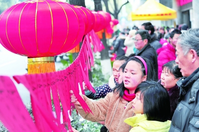 2月12日,湖北省宜昌市夷陵区举行喜迎元宵灯谜会有奖竞猜活动,当地图书馆精心制作展出了将廉洁清风及生态文明和民俗文化融入主题的谜语2000多条,吸引众多市民和孩子们竞相参与竞猜,欢庆元宵佳节到来。图为猜谜现场。 张国荣 席云峰图并文