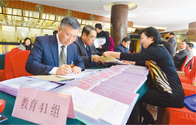 3月1日,出席全国政协十二届二次会议的委员陆续报到。图为在北京国际饭店委员驻地,政协委员们在领取报到材料。人民视觉