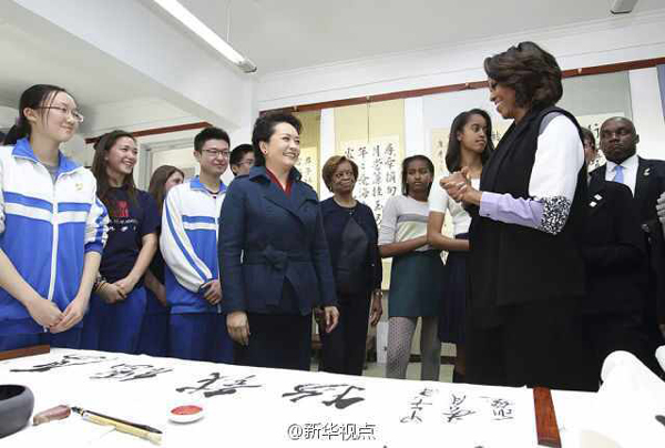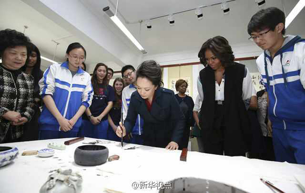 彭丽媛和米歇尔走进美术教室,中外学生正在上中国书法课。应学生邀请,彭丽媛欣然提笔,挥毫写下“厚德载物”,并赠送给米歇尔。