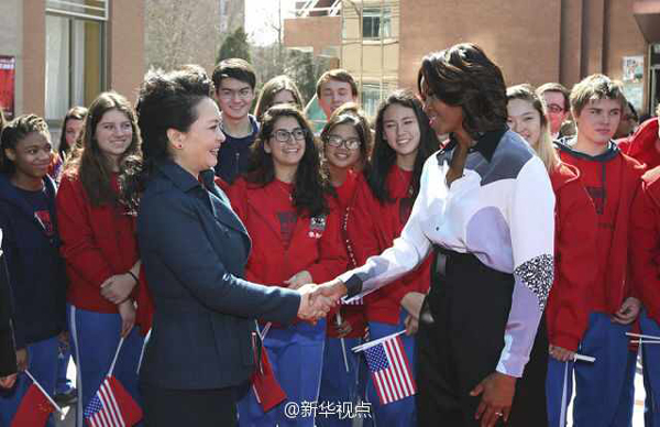 新华网北京3月21日电 据新华社“新华视点”微博报道,21日上午,习近平主席夫人彭丽媛与奥巴马总统夫人米歇尔一起来到北师大二附中参观。教学楼前,学生们手挥两国国旗,热情欢迎两国元首夫人。