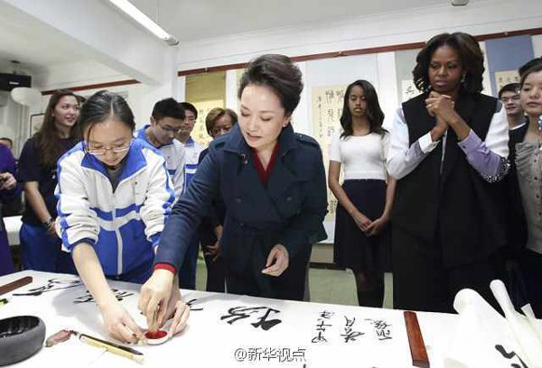 米歇尔和学生一起临摹汉字“永”,彭丽媛在旁拿起毛笔示范握笔。米歇尔连着写了两个“永”字,直夸中国书法太美了,说自己还要多练习。