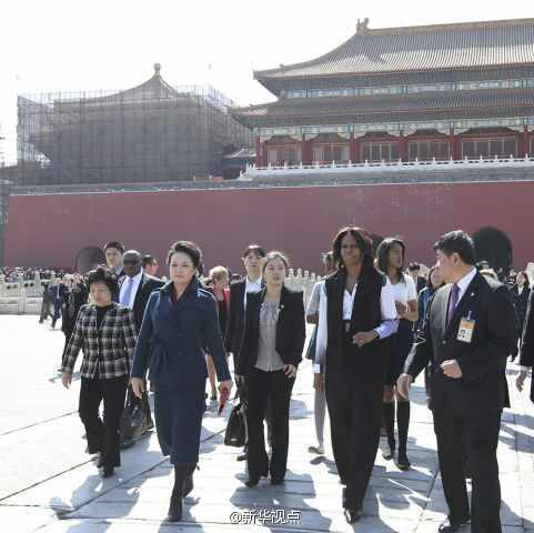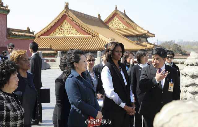 北京3月21日电 据新华社“新华视点”微博报道,21日,彭丽媛和米歇尔一起参观故宫。故宫博物院院长单霁翔介绍说,故宫在北京的中轴线上。在美国华盛顿,国会山到林肯纪念堂也在一条中轴线上,这说明中美在建筑和城市规划上也有相通之处。