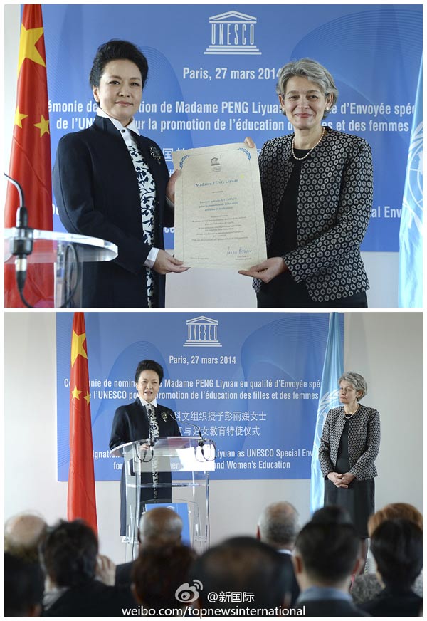 新华网北京3月27日电 据新华社“新国际”微博报道,习近平主席夫人彭丽媛27日在巴黎联合国教科文组织总部被授予“促进女童和妇女教育特使”荣誉称号。从博科娃总干事手中接过证书后,彭丽媛说,这是一项崇高的事业,我愿意尽我所能,帮助更多孩子,为更多姐妹争取接受教育的权利。