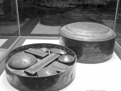 彩绘双层九子漆奁(lian,古代妇女梳妆用的镜匣)